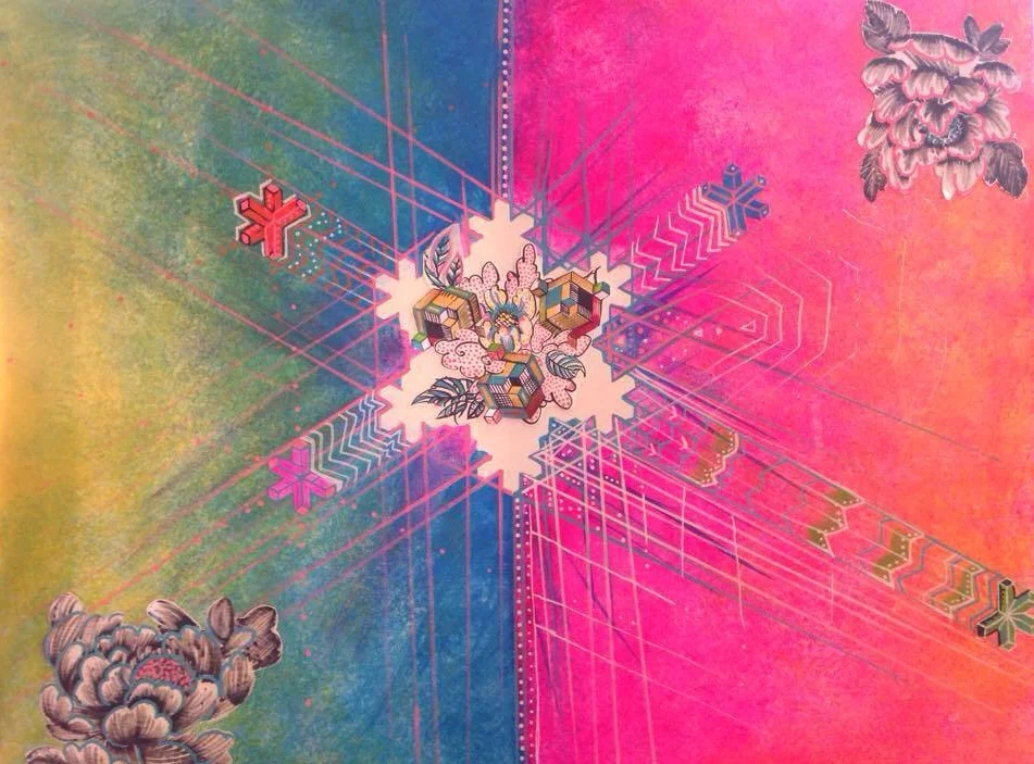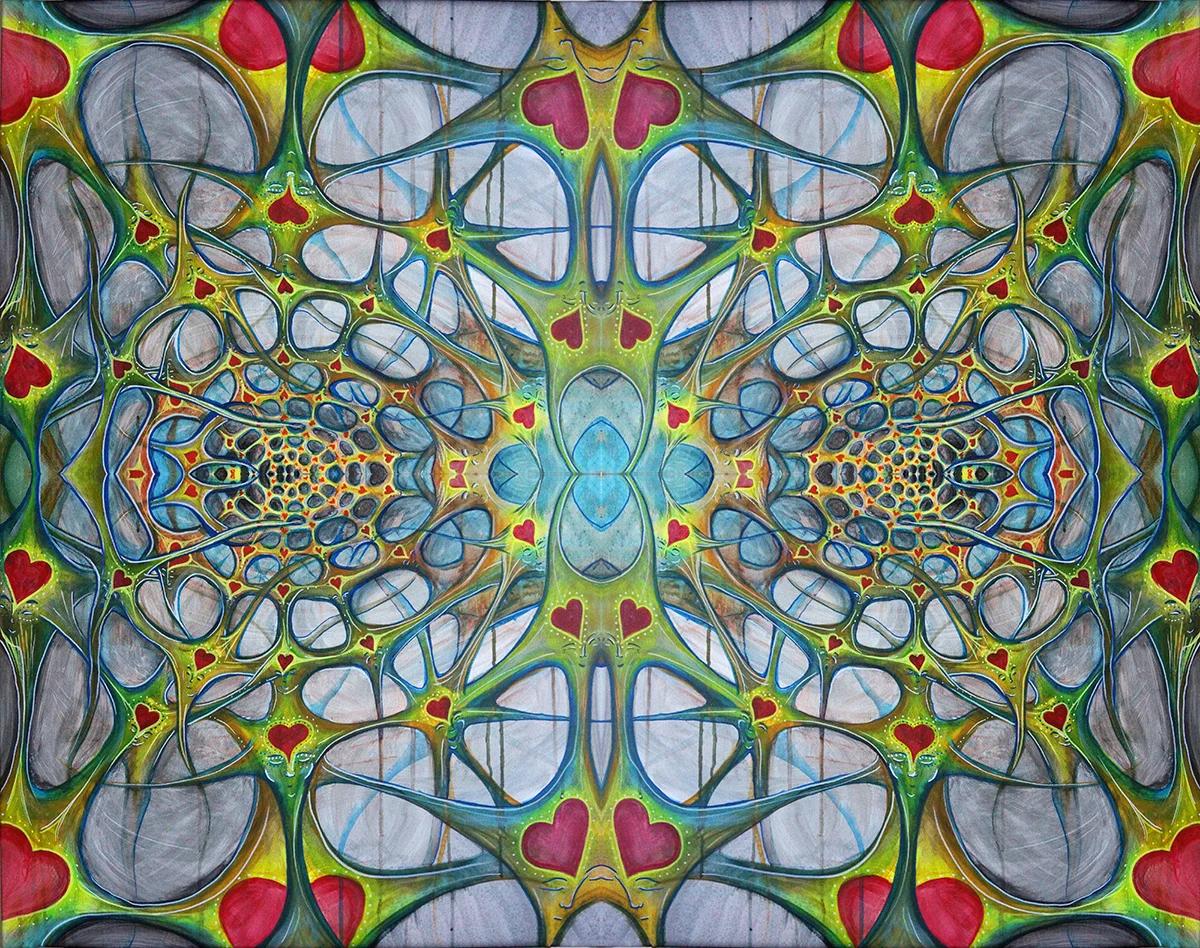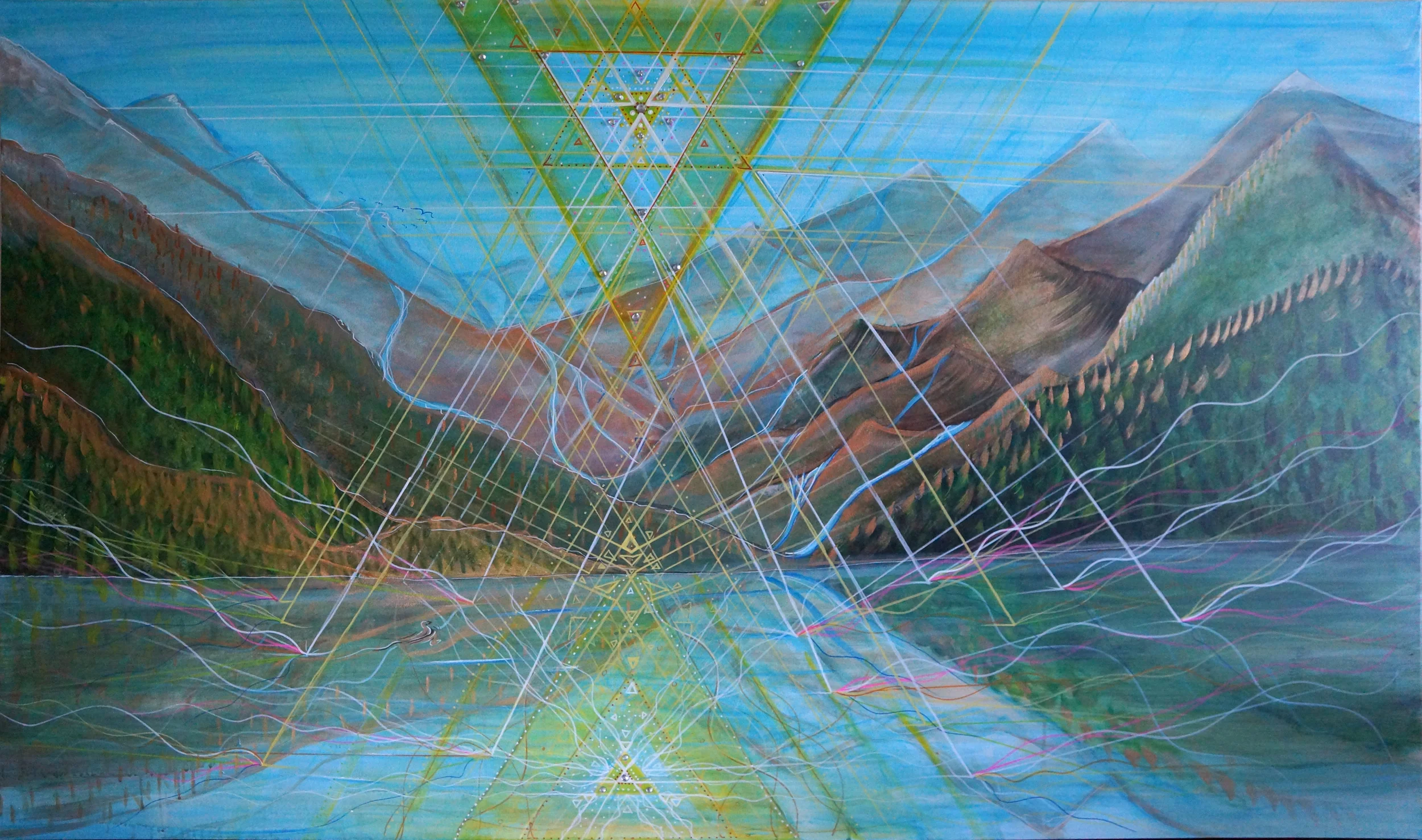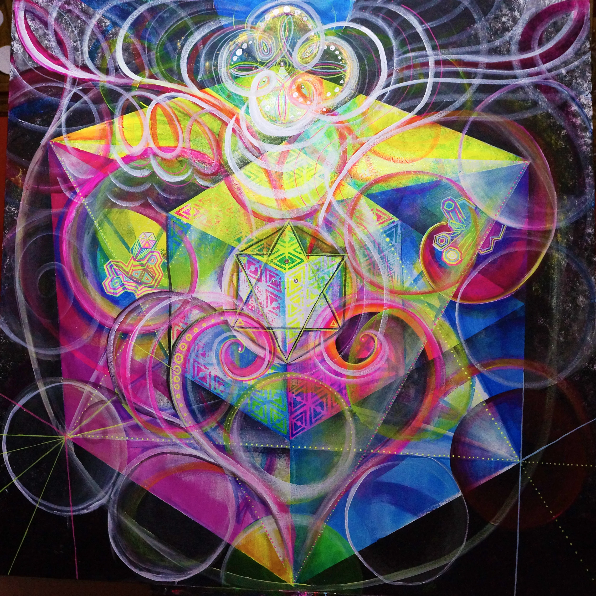 4ftx4ft, UV Reactive, glow in the dark, and dayglo paints on canvas. Sacred Geometry and emotion play together.